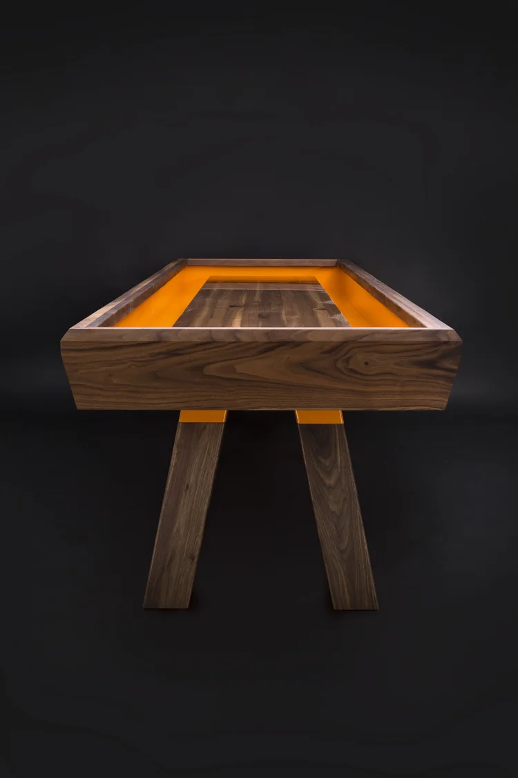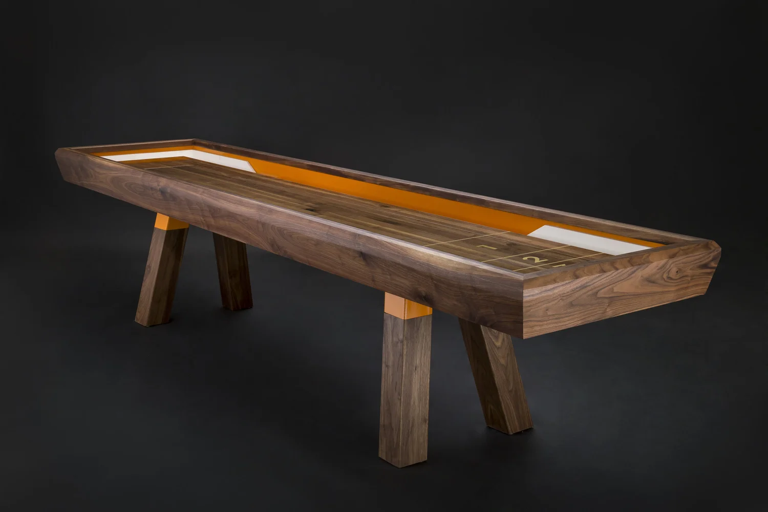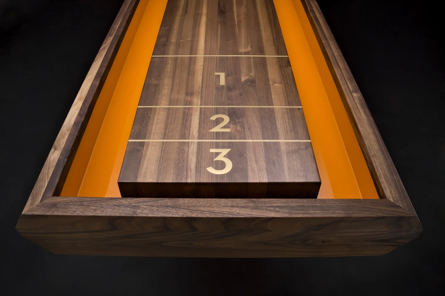 The shuffleboard has always been the cornerstone of craftsmanship. The game had some of its early advocacy from American cabinetmakers in New York whom used the game to show off their finest inlaid cabinet work. This elegant and stately table aims to resurrect the class and game from the past.