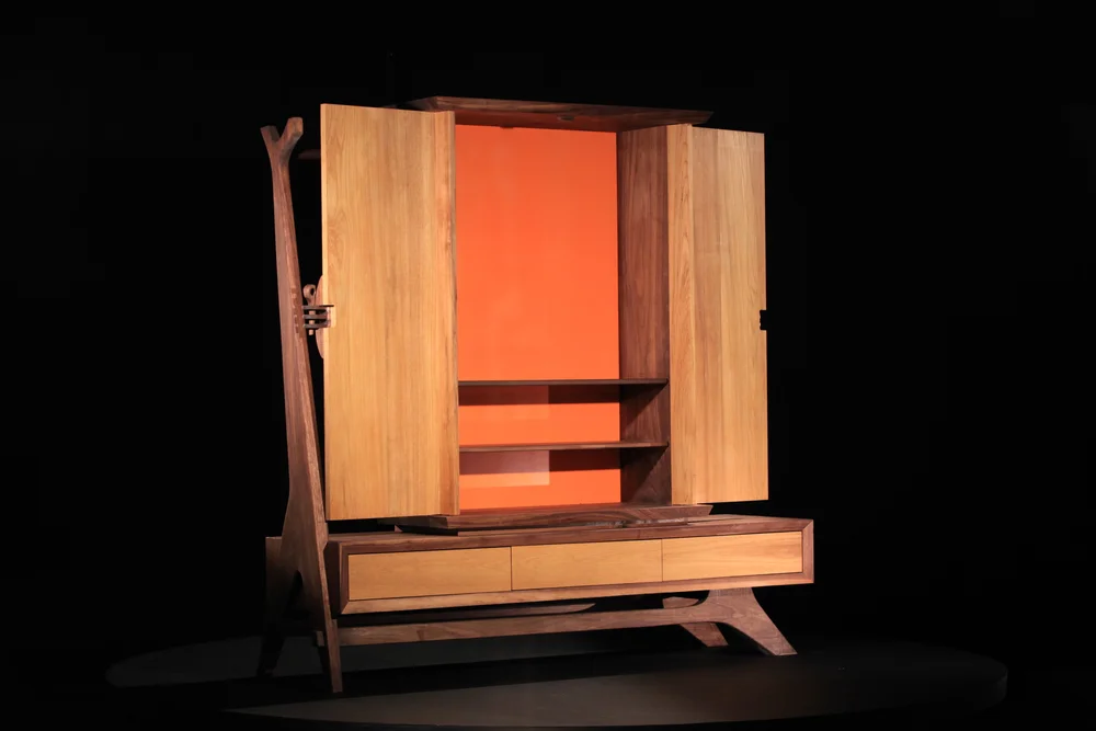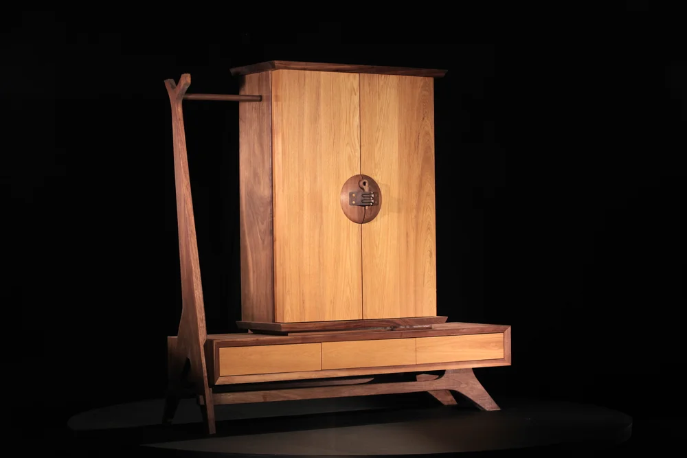 Once I was done with the legs, I started on the large box that sat on top of the shoe compartment; I wanted this to sit tight and clean, so I mortised in the two sides made of 6/4 walnut into both the top and bottom. For the doors, I wanted them to wrap around the sides about 6”, this is one area I probably should have simplified if I would have know the problems that lay ahead, but as usual I couldn’t help myself.  The doors are made of 4/4 Teak and, I think, the only decent way to hinge a door like this is by using a ball bearing on both the top and bottom. I hate seeing any hardware, so this is a technique I use often.
