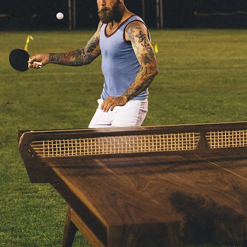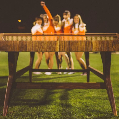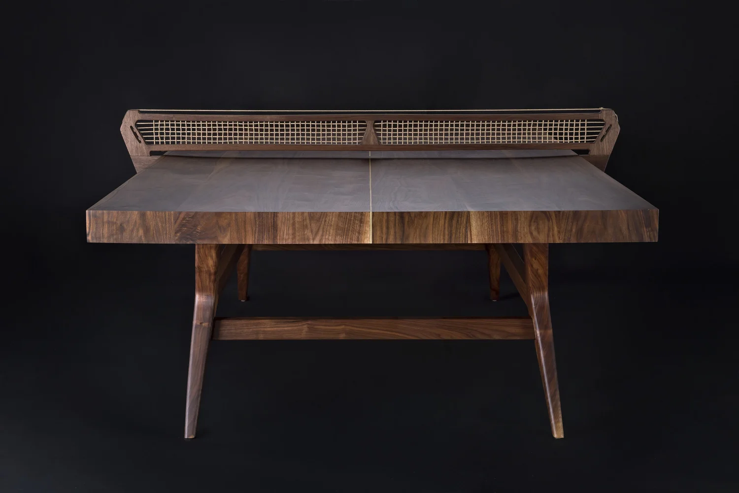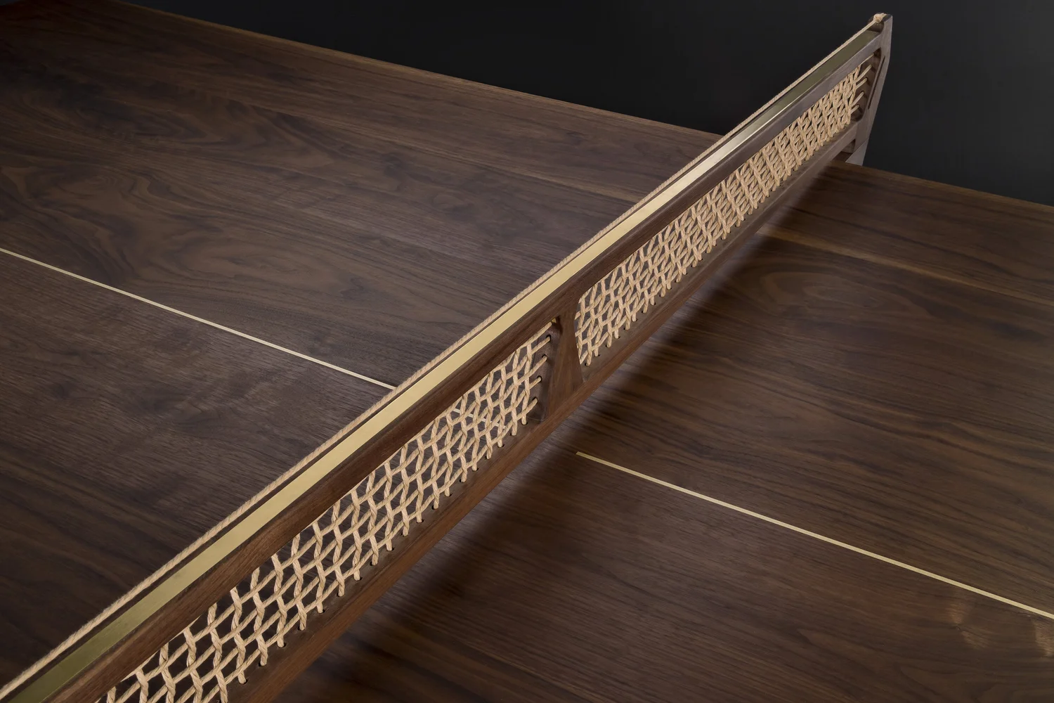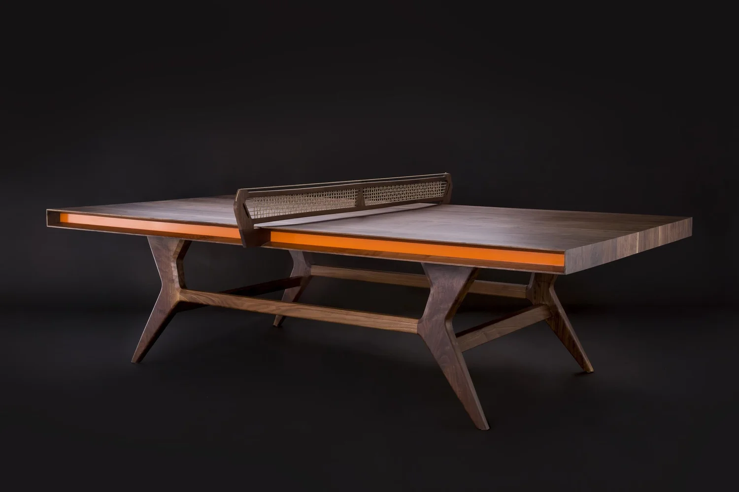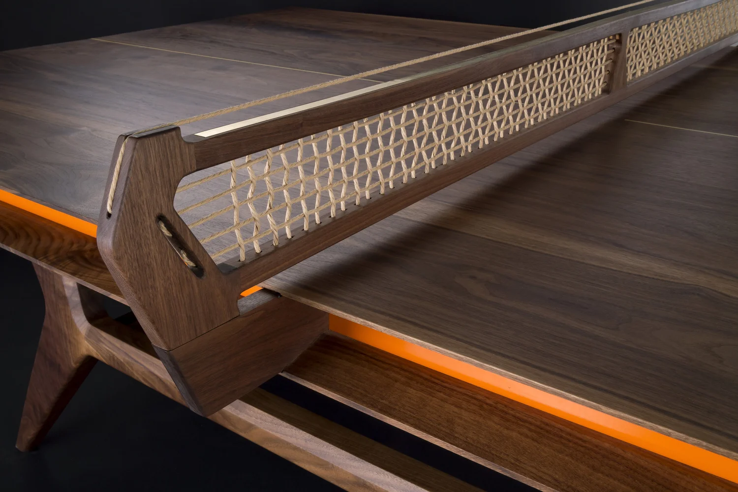 “Whiff-waff” has come a long way from its humble roots. Starting as a game soldiers would play to kill time, they used books to mark the net and a golf ball to volley. Jory sought out to create something a little more memorable. Forged from walnut the table is accented with a strip of orange, tasteful brass inlay, and a net comprised of a classic Danish weave.