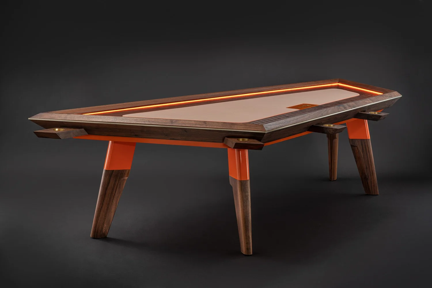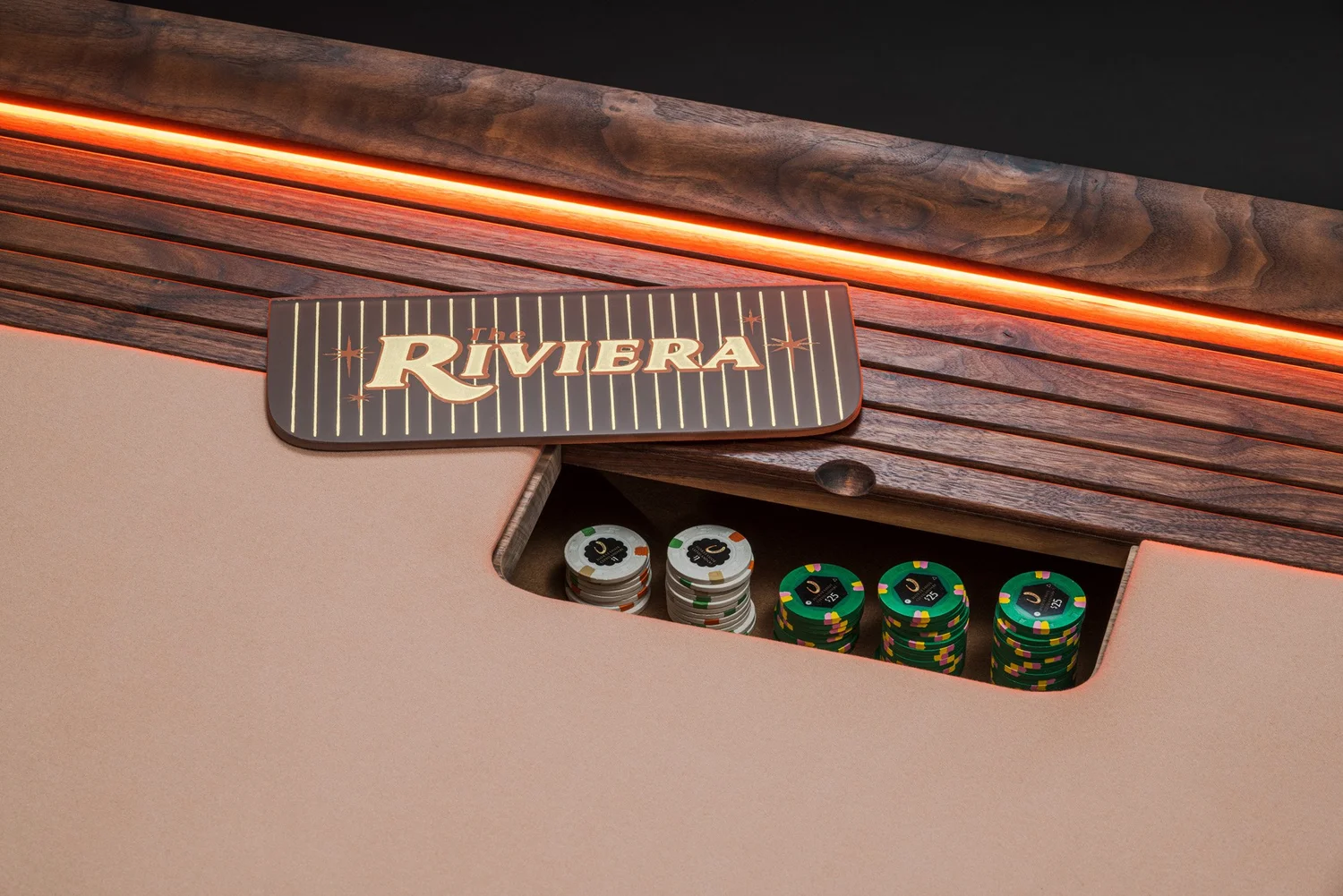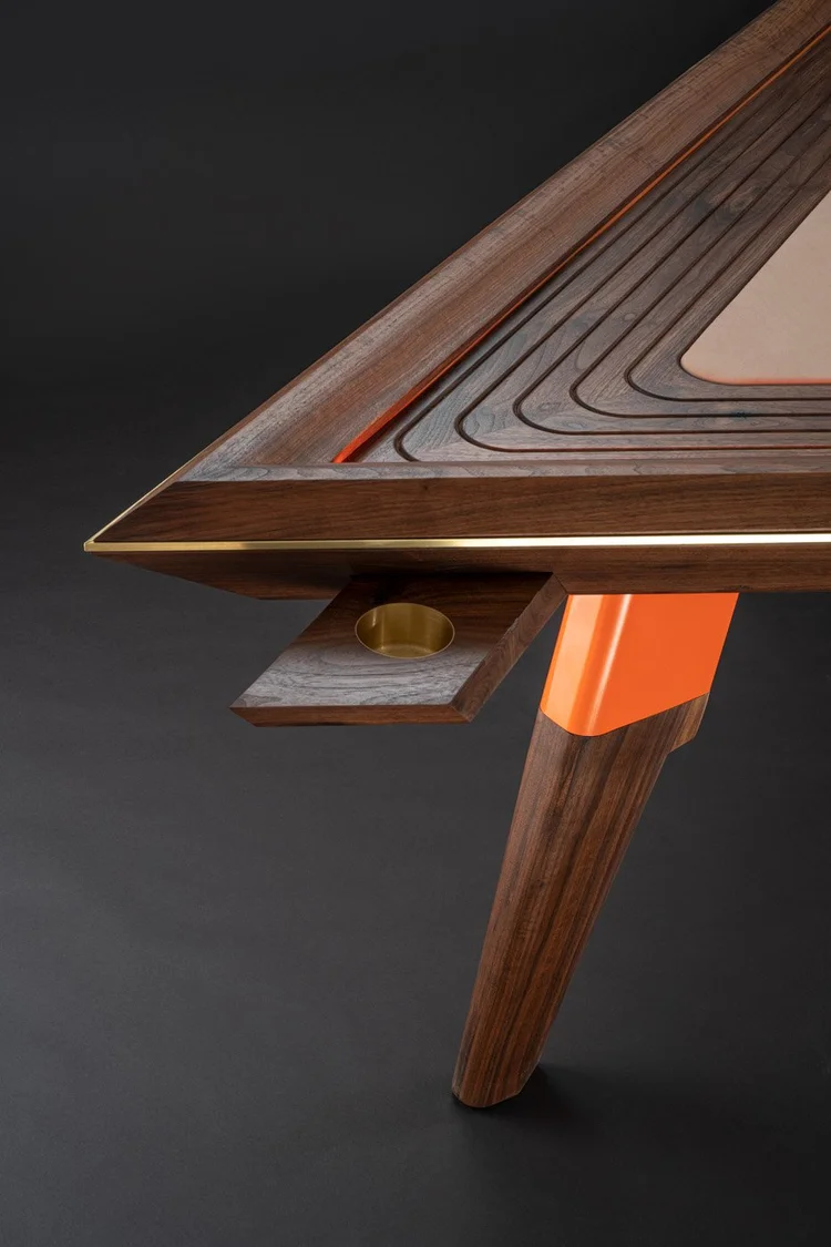 The Riviera poker table is walnut with brass details, optional pull out cup holders, LED lighting, handpainted, goldleaf chip cover, and BBO poker table cloth. The colors and material are customizable with all our products being made to order.